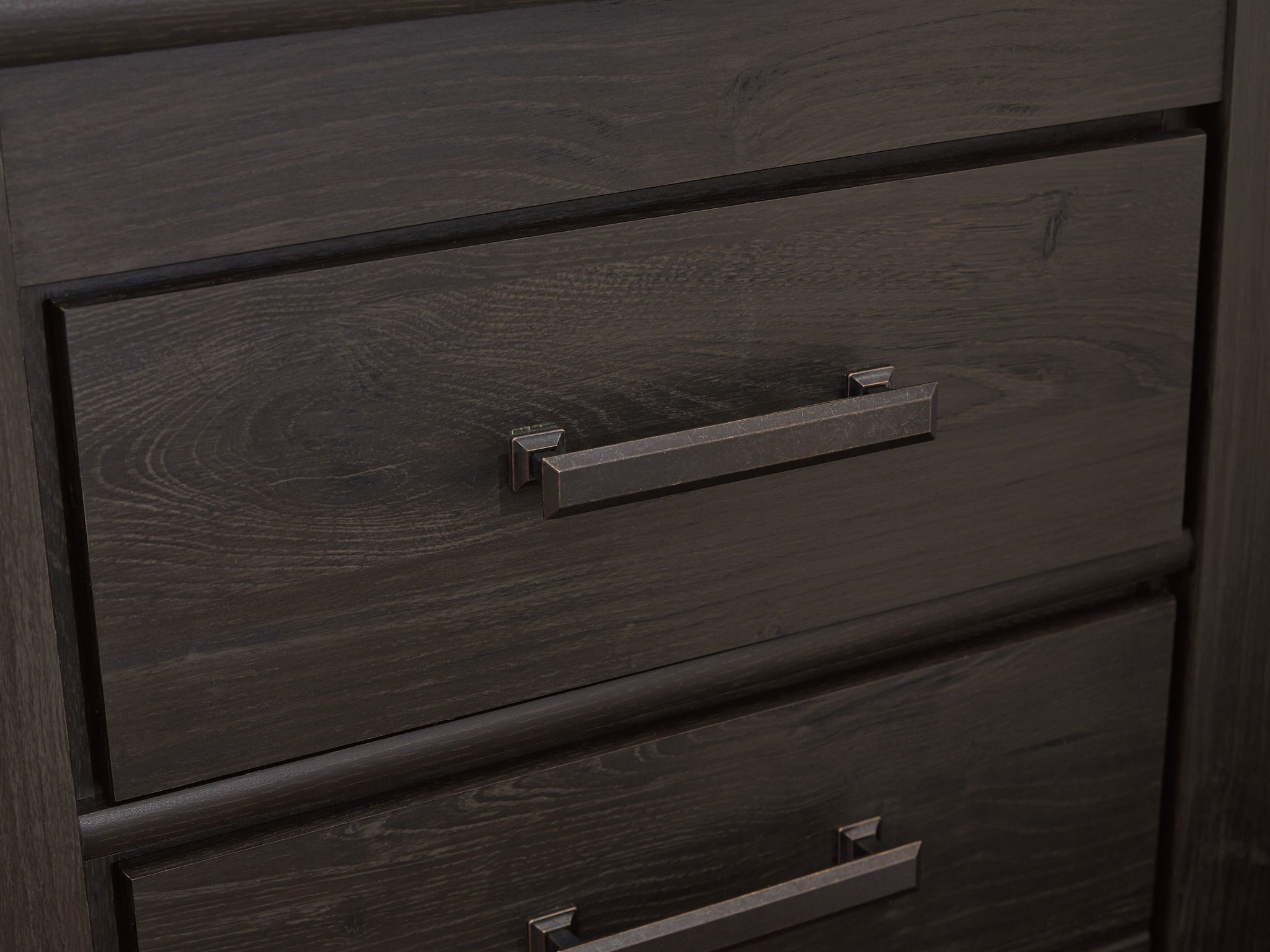 Priced to entice and styled to impress, this dresser makes the most of a clean-lined, contemporary profile. With three drawer sizes scaled to meet your needs, the design merges cool form and practical function. Replicated oak grain effect gives the modern, charcoal gray finish warmth and character. Linear pulls are a sleek touch.