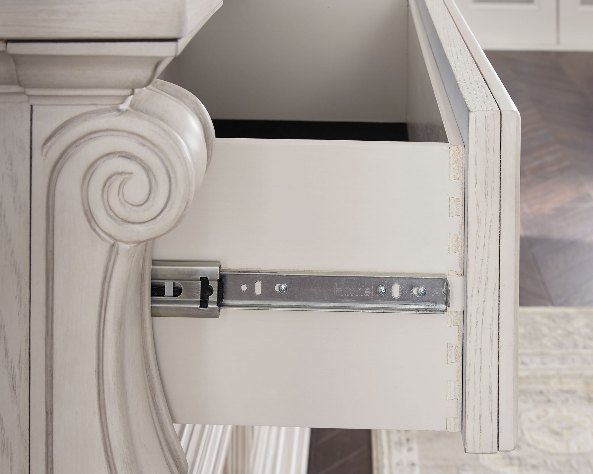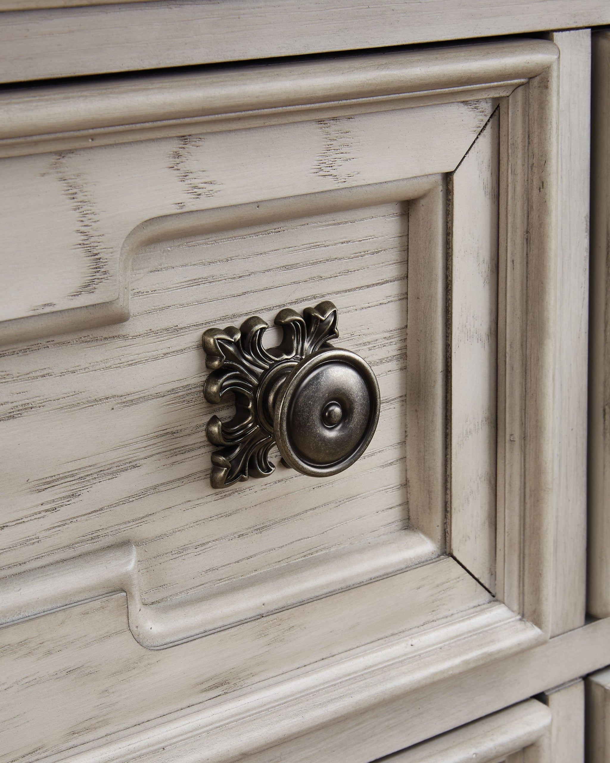 Inspired by the grandeur and grace of European traditional style, this opulent dresser is nothing short of stunning. Its large-scale decorative scrolled pilasters, along with an ash swirl border and walnut inlay crowning the top, are sure to make a sophisticated statement in your restful retreat. A timeless antiqued white coloration and bronze-tone drawer pulls lend an air of subtle elegance to this sumptuous piece.
