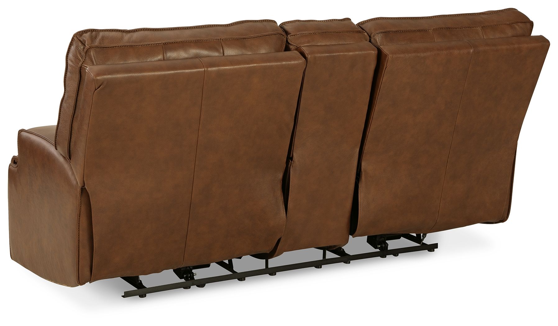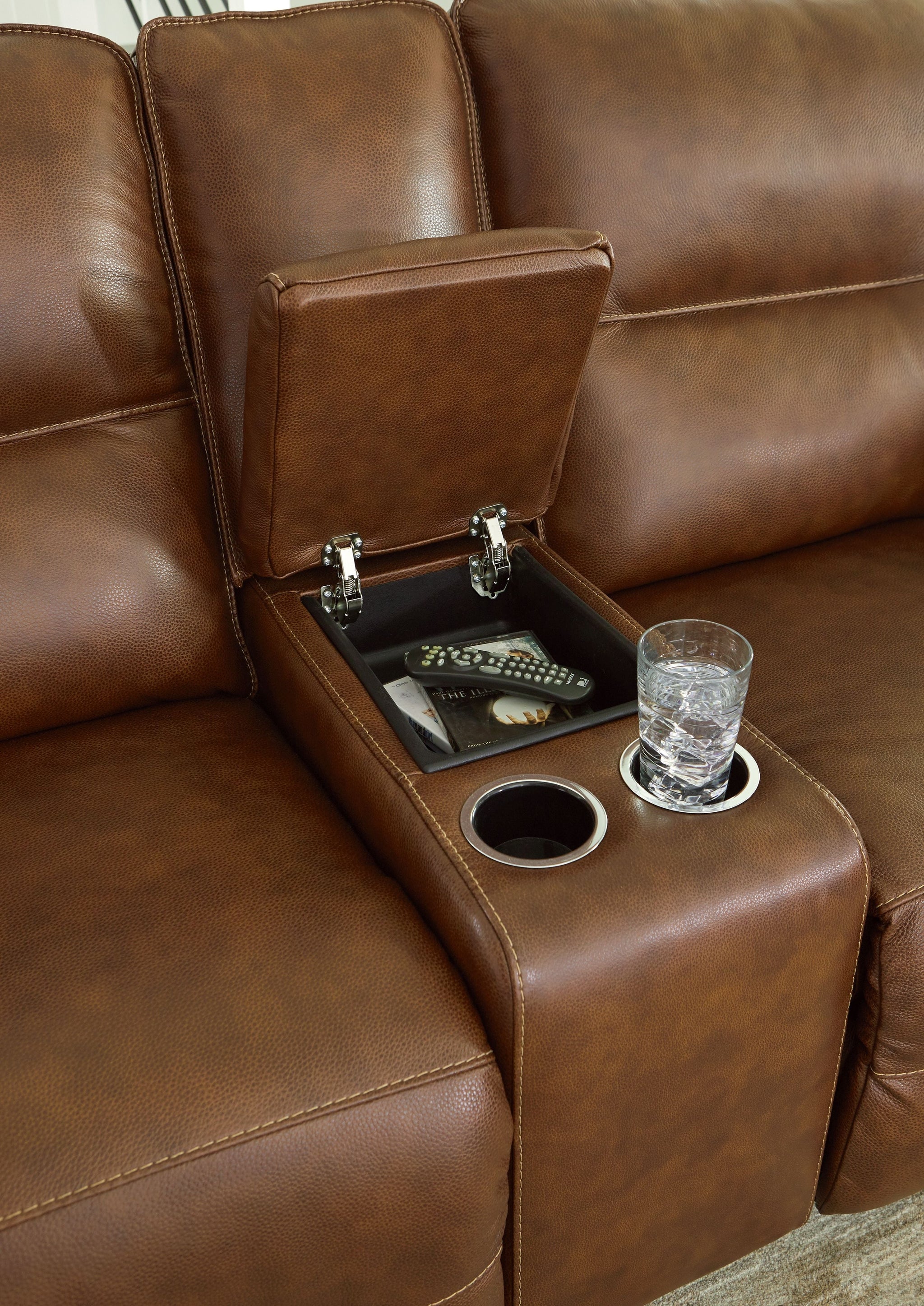 Master statement-making contemporary comfort with this power reclining loveseat. It displays a striking yet streamlined profile, with expertly matched leather and faux leather upholstery in an auburn hue balancing natural beauty and refined design. Adjustable headrests and USB charging polish off this richly crafted piece.