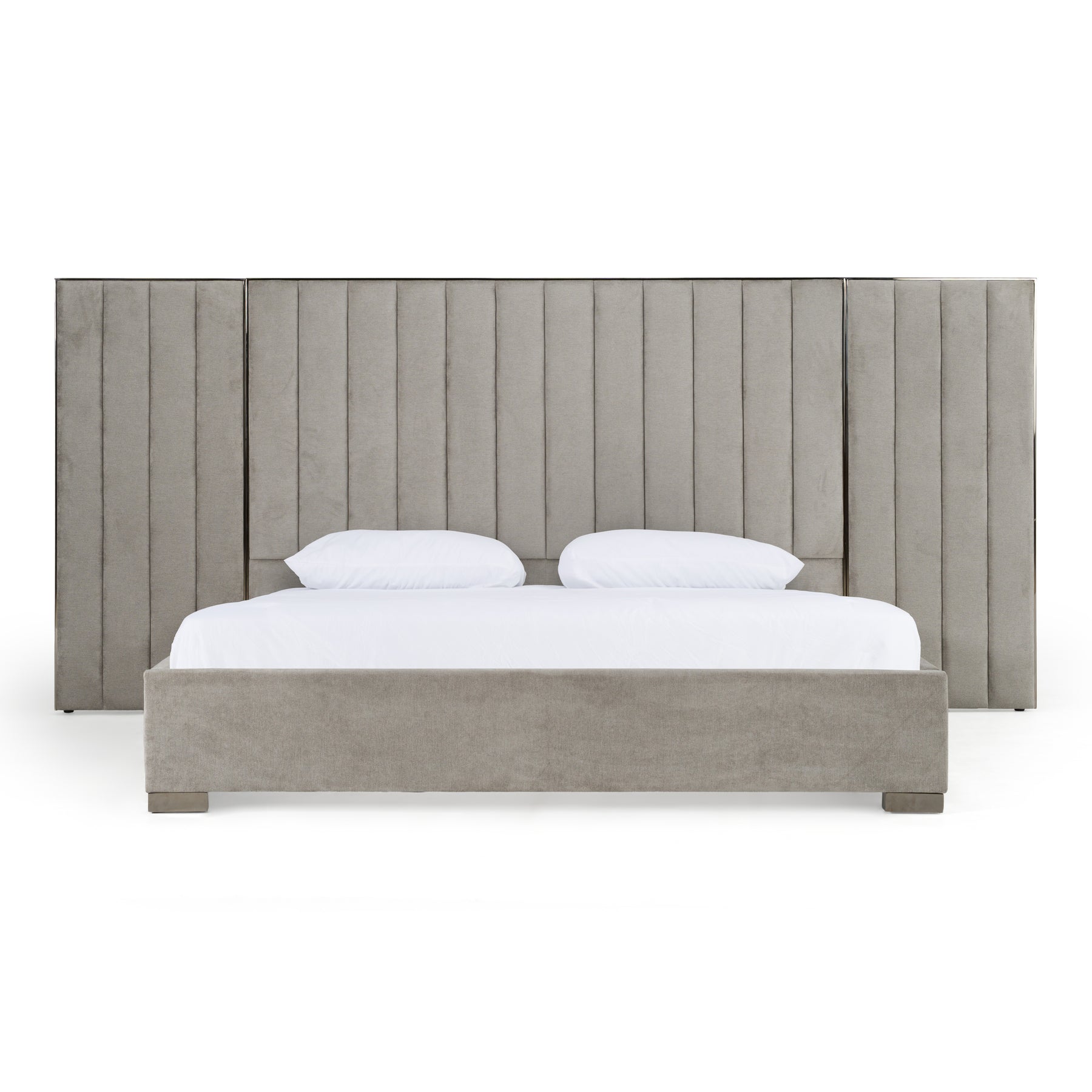 The Modrest Buckley bed combines comfort and style with its luxurious grey fabric upholstery, blending 35% cotton with 65% polyester for a soft yet durable finish. The sleek black stainless steel legs add a modern, sophisticated touch, providing sturdy support with a weight capacity of 528 lbs. Designed for a 10-inch mattress, this bed includes two center support legs for extra stability. While some assembly is required, the final result is a refined and contemporary piece perfect for any bedroom.