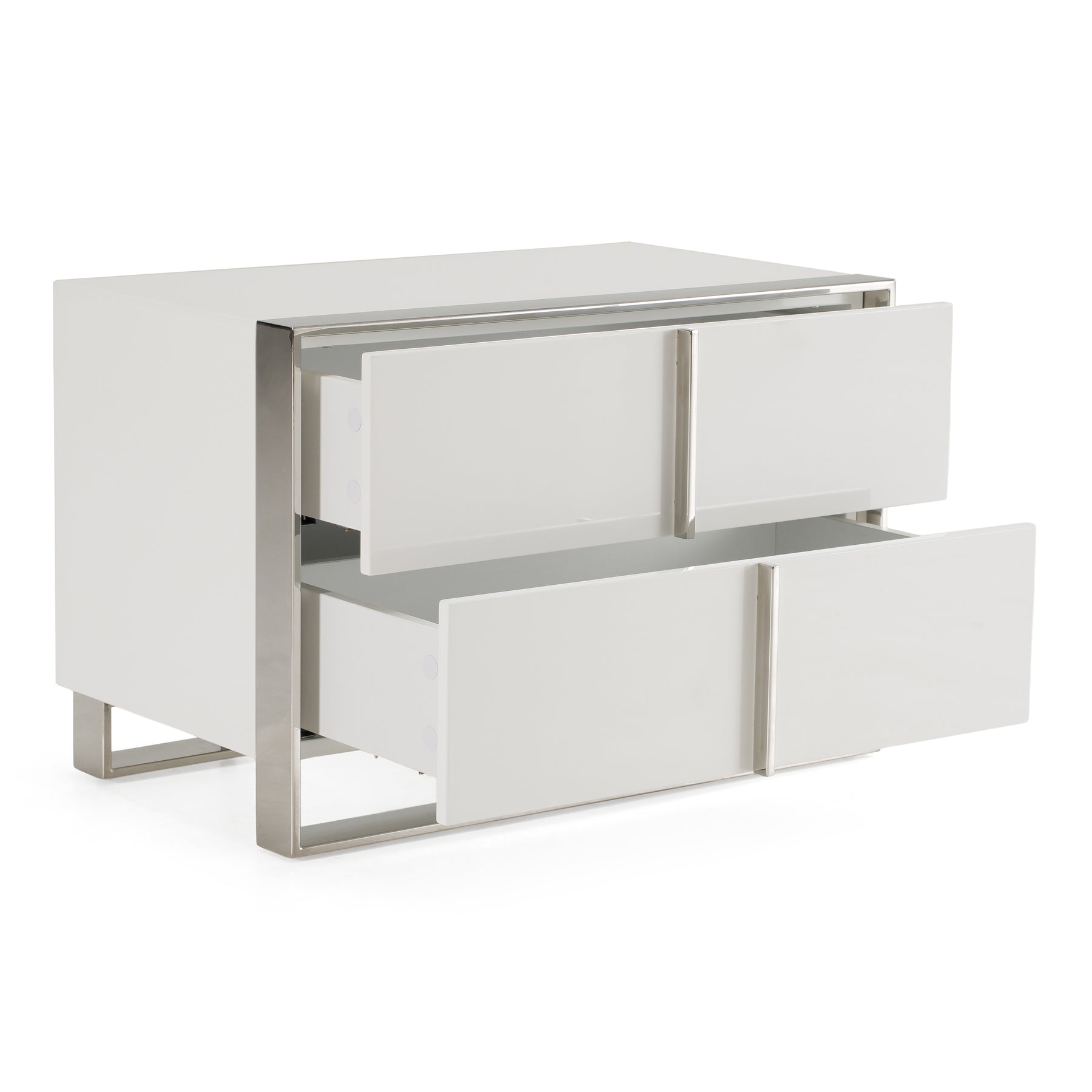 The Nova Domus Cartier Nightstand is a credit to its brilliant designer. The stainless steel metal framing masterfully surrounds the bold white high gloss of the nightstand. Two soft closing drawers create ultimate functionality. Perfect for a glamourous modern home, this nightstand will pair perfectly with the Cartier Dresser, Bed, and Chest for a full set.