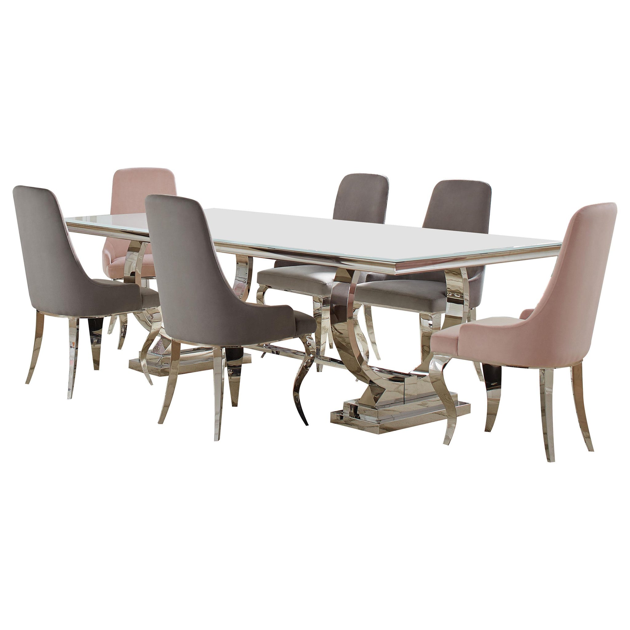 Elevate your dining experience with our 7-piece dining set. The elegant dining table features an expansive opaque white tempered glass surface. Its stainless steel trestle base, adorned with gleaming chrome-finish ring-shaped end supports, adds a sophisticated touch. Complementing the tables opulence, our upholstered side chairs boast soft velvet upholstery and polished chrome legs, blending luxury with comfort. Crafted from stainless steel, these chairs promise durability and opulence. The set includes six expertly cushioned dining chairs, in refined hues, adding curves and excellence. Transform your space into a haven of sophistication, where every meal becomes a lavish experience.