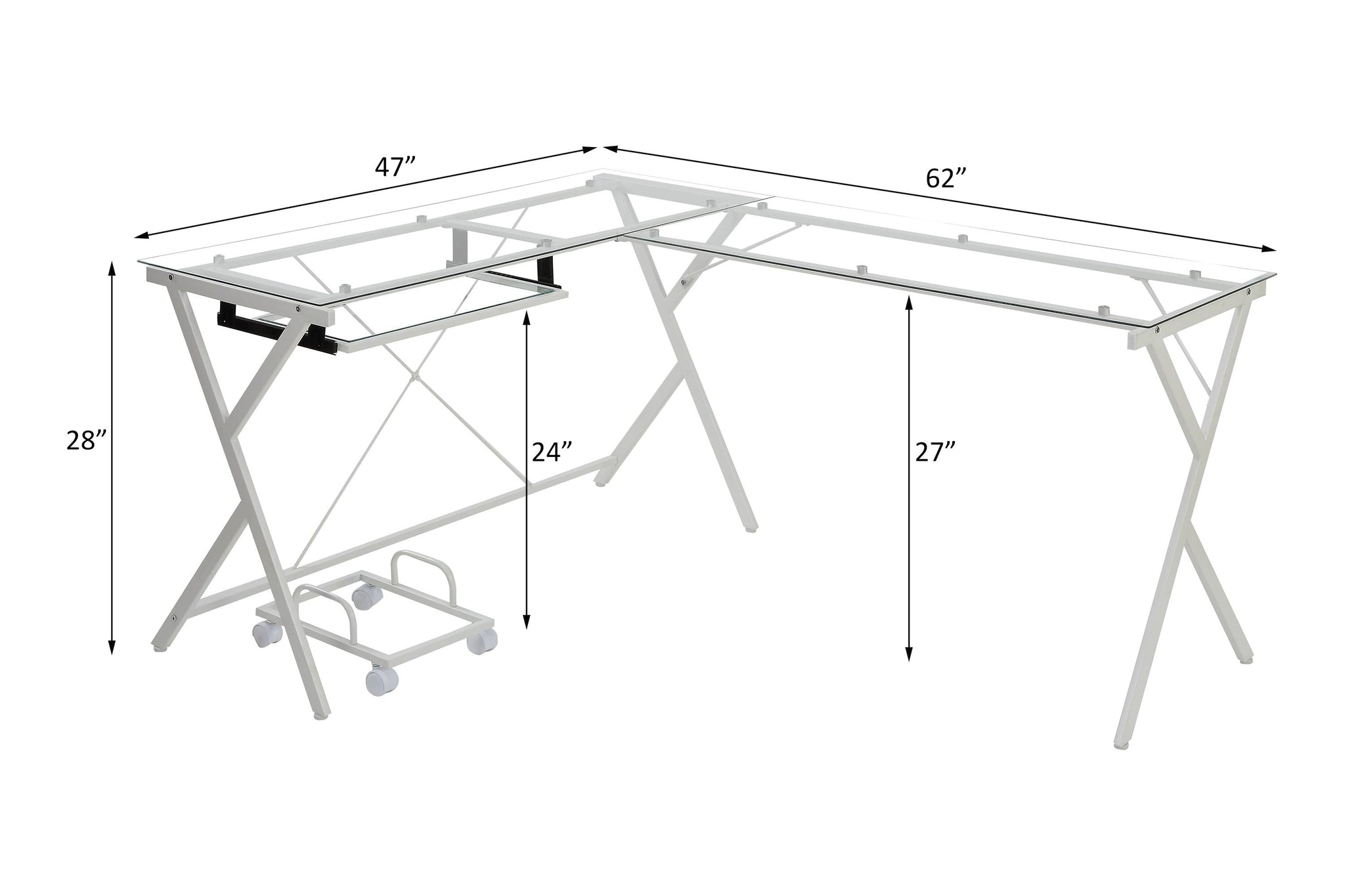 Corner Computer Desk Orientation: "L" ShapeX-Shape Metal Frame BaseRectangular Table Top w/Tempered GlassKey Board Tray IncludedComputer Holder Included