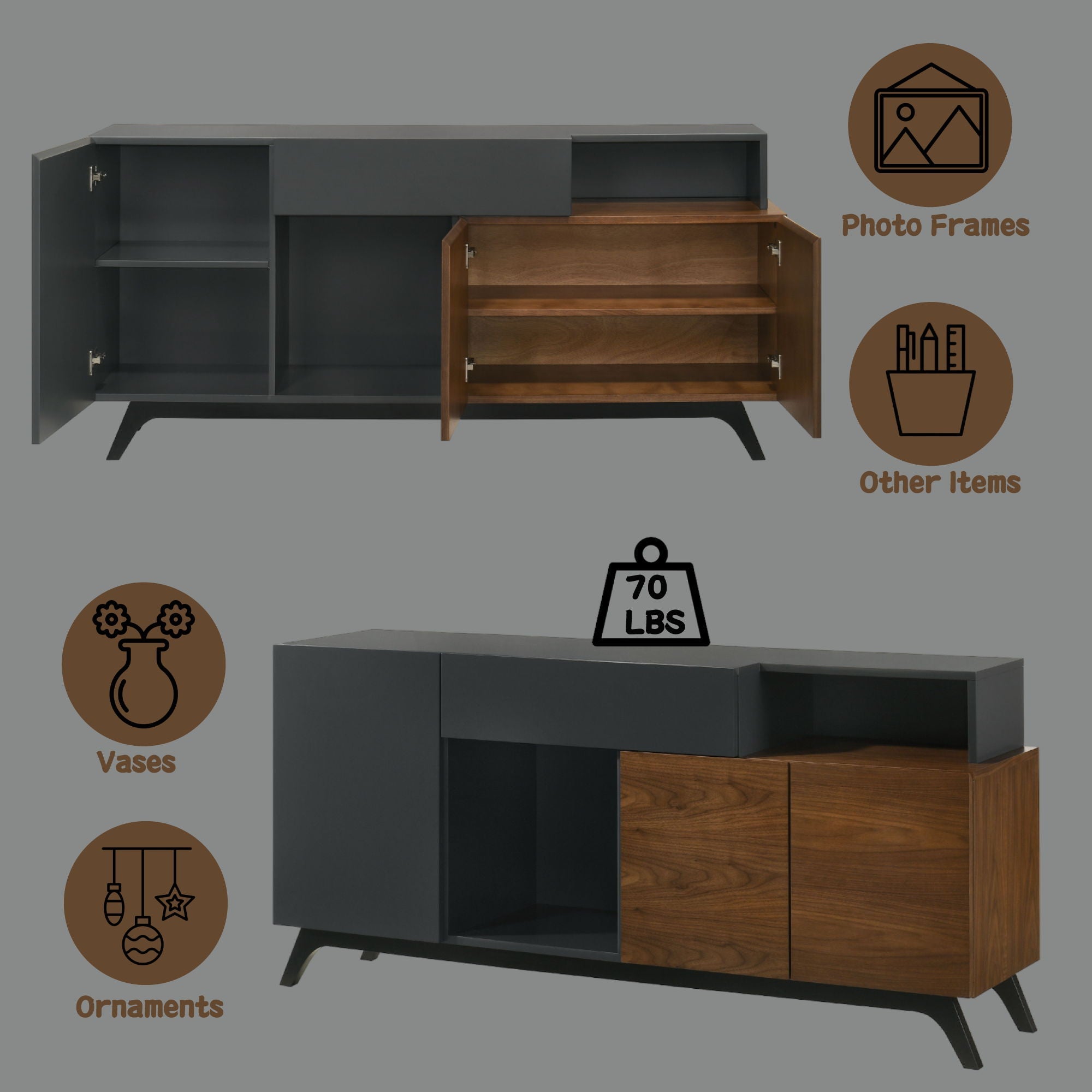 • Ample Storage: The side server includes a storage drawer, two open compartments, and three doors with shelves, offering extensive storage options to keep your dining area organized and clutter-free.