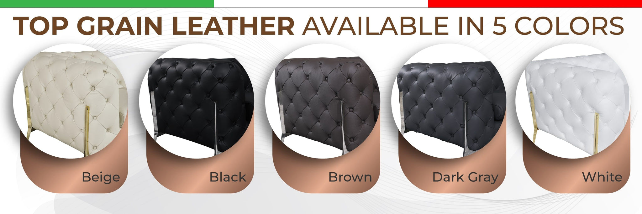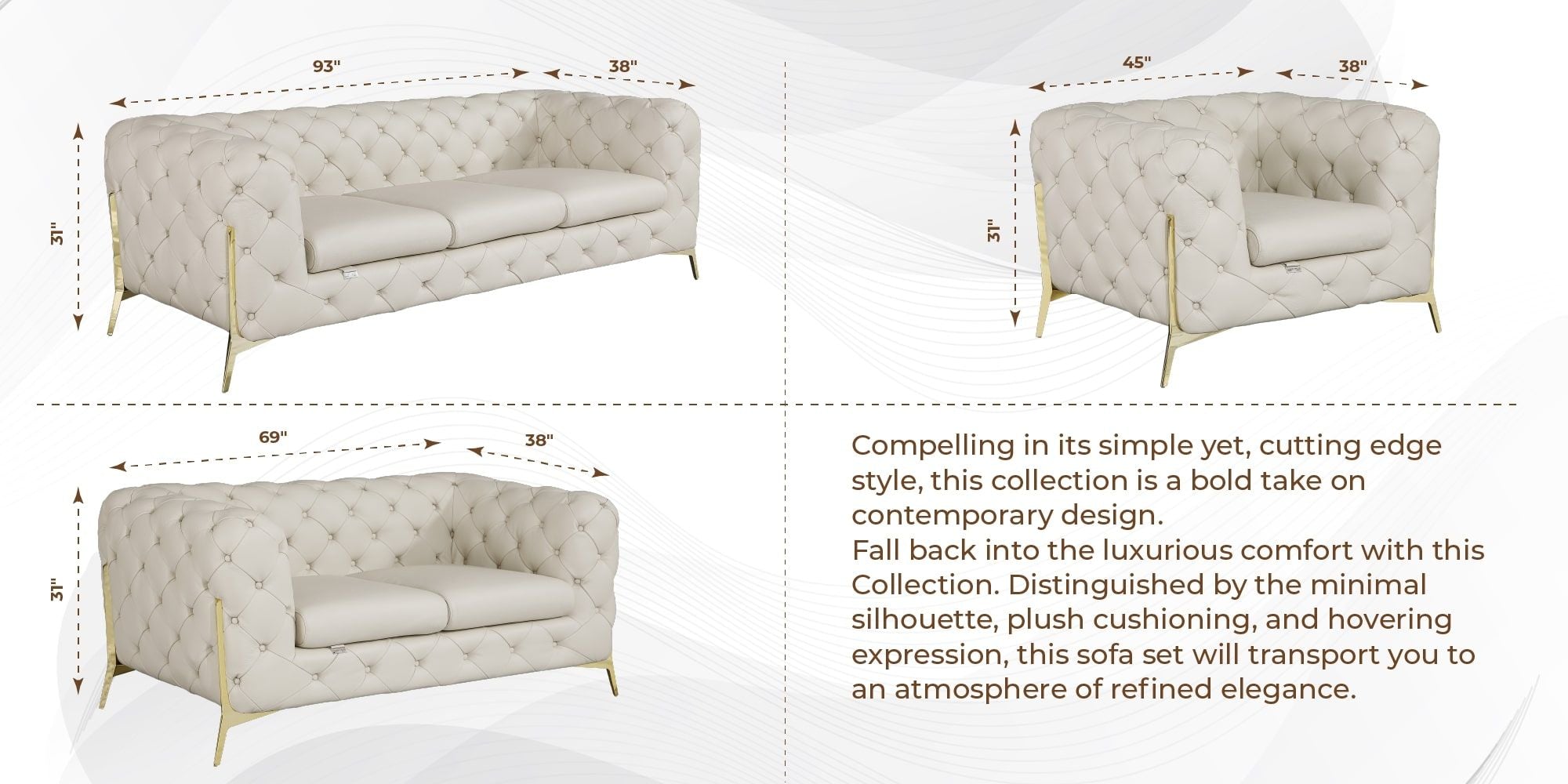 Upgrade your living space with this contemporary 100% top-grain Italian leather sofa set, featuring sleek lines, generous cushioning, and stainless-steel chrome accents. Designed for both style and comfort, this modern sofa set showcases premium Italian leather—known worldwide for its beauty, durability, and luxurious feel. Each piece is built with a solid wood frame and inspected at every stage of production to ensure exceptional quality. Experience the elegance, craftsmanship, and long-lasting comfort of true Italian leather furniture.