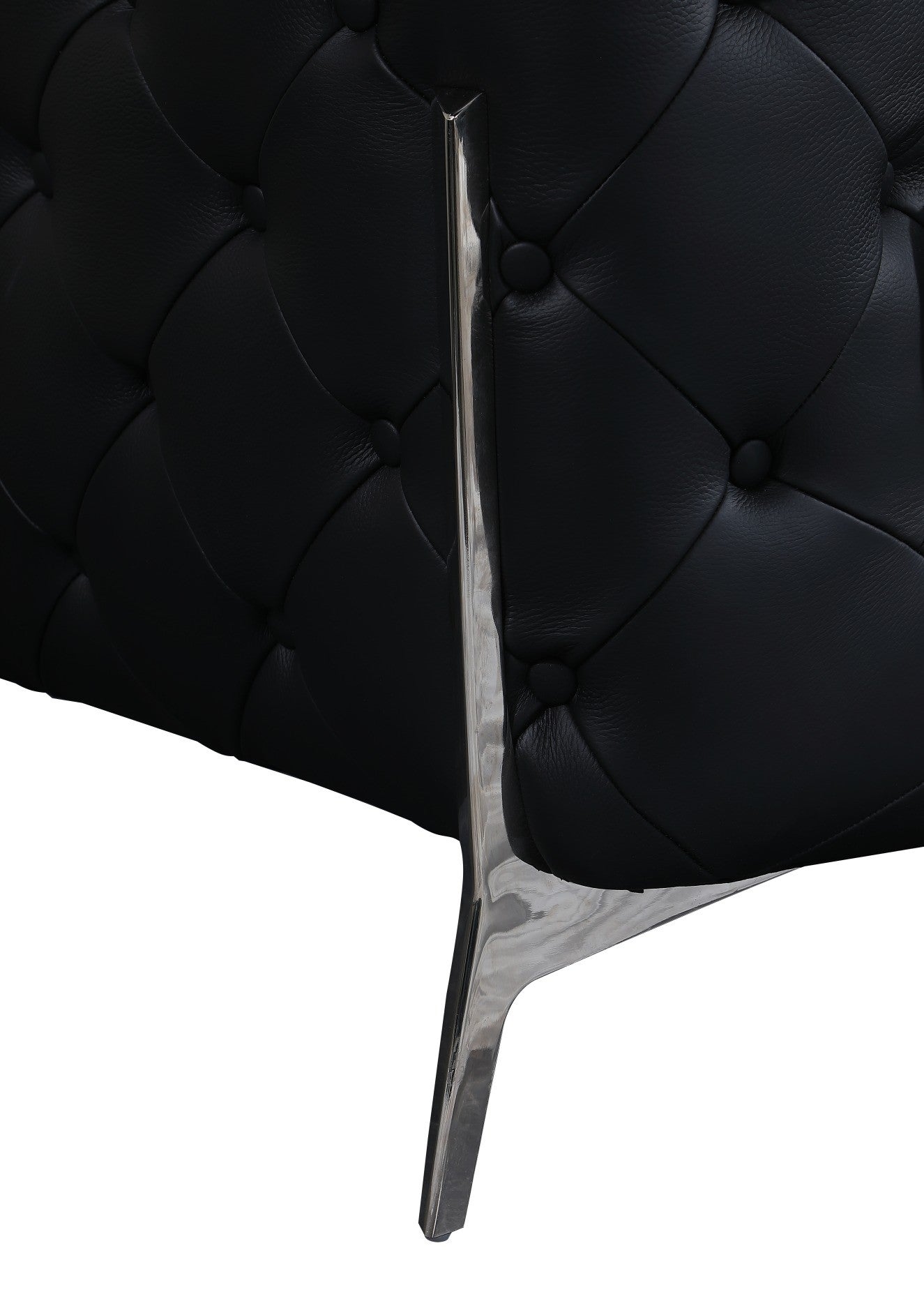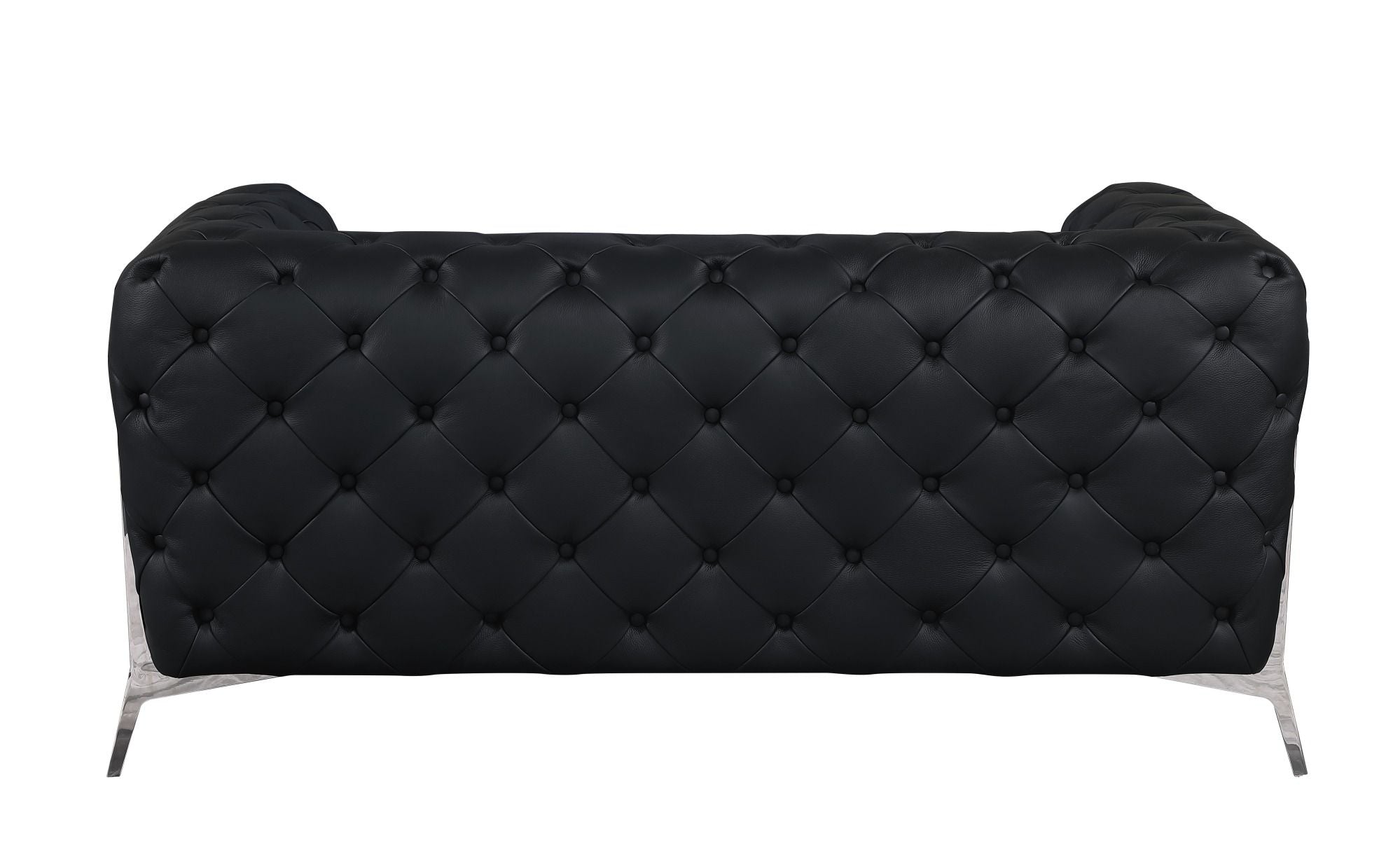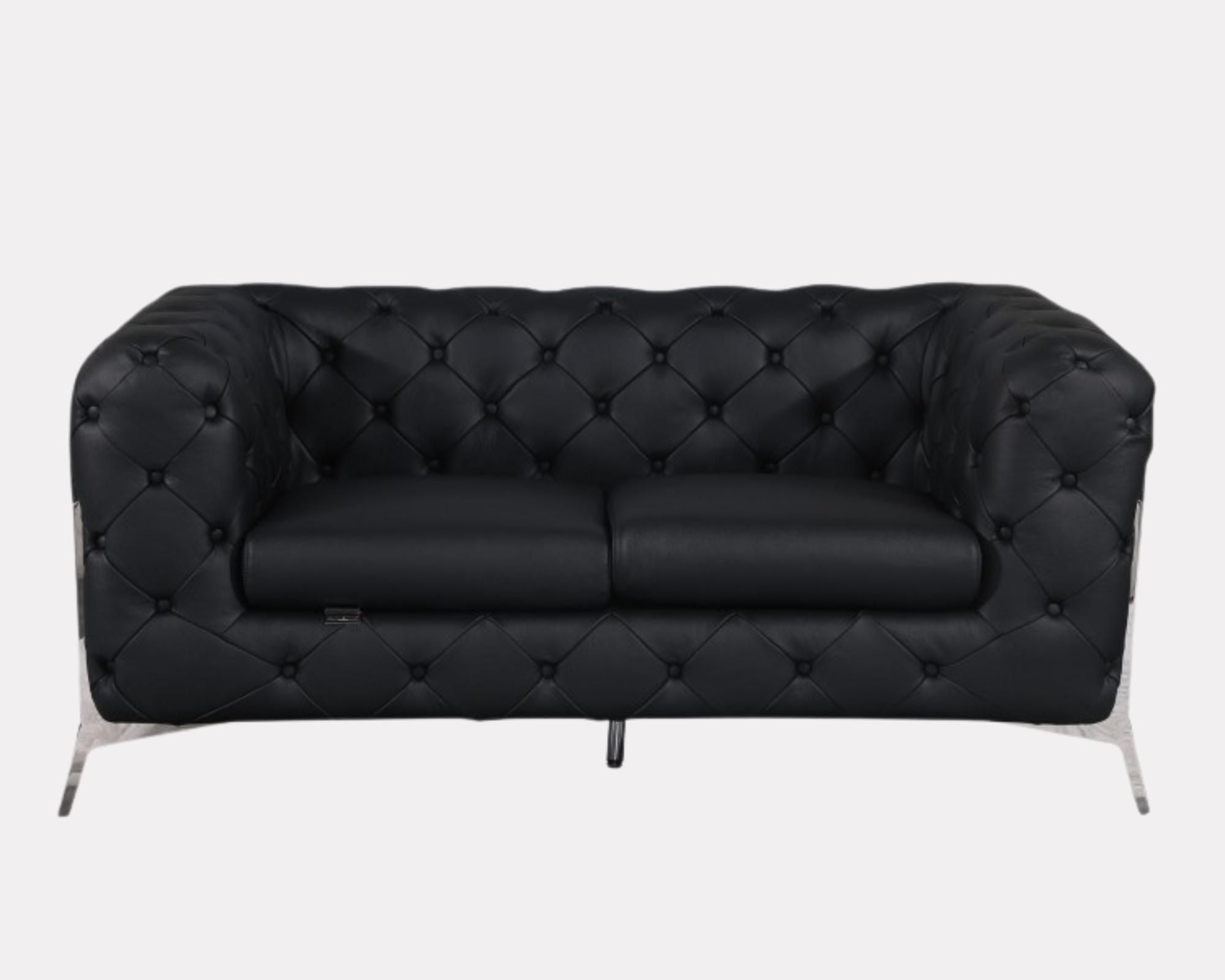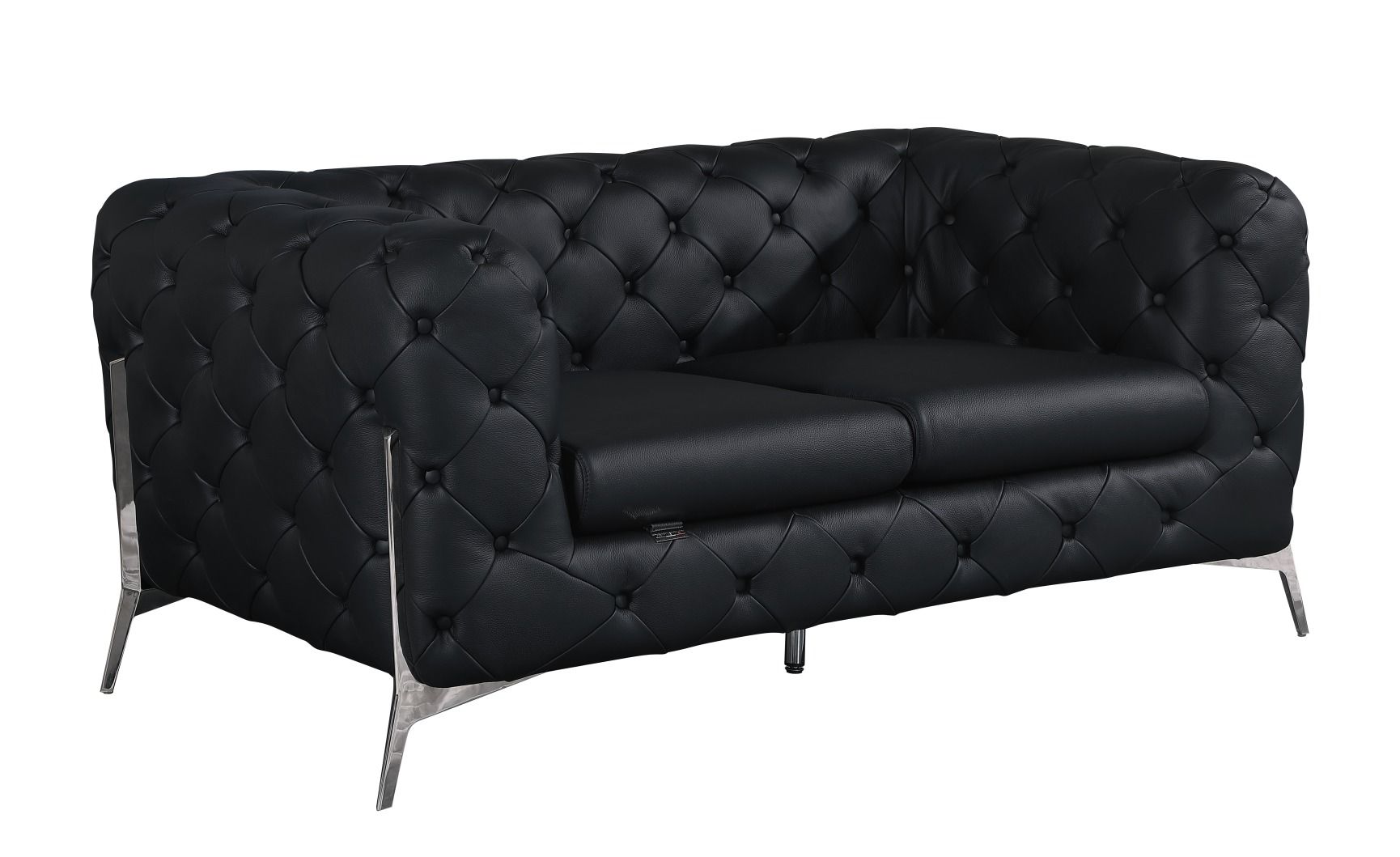 Compelling in its simple yet, cutting edge style, this 100% Top-Grain Italian leather loveseat is a bold take on contemporary design. Fall back into the luxurious comfort with this collection. The gorgeous, stainless-steel chrome legs and trim ads a beautiful contrast to the Italian leather upholstery. Distinguished by the minimal silhouette, plus cushioning, and hovering expression, this sofa set will transport you to an atmosphere of refined elegance. Starting from the designs to the finished product, each step of the production is checked rigorously for quality. The selection of Top-Grain Italian leather for the upholstering and solid wood for the frame is done with the utmost respect for the finest raw materials. Italy is world renowned for high quality leather. You can smell, feel and see its high quality in every sofa set.