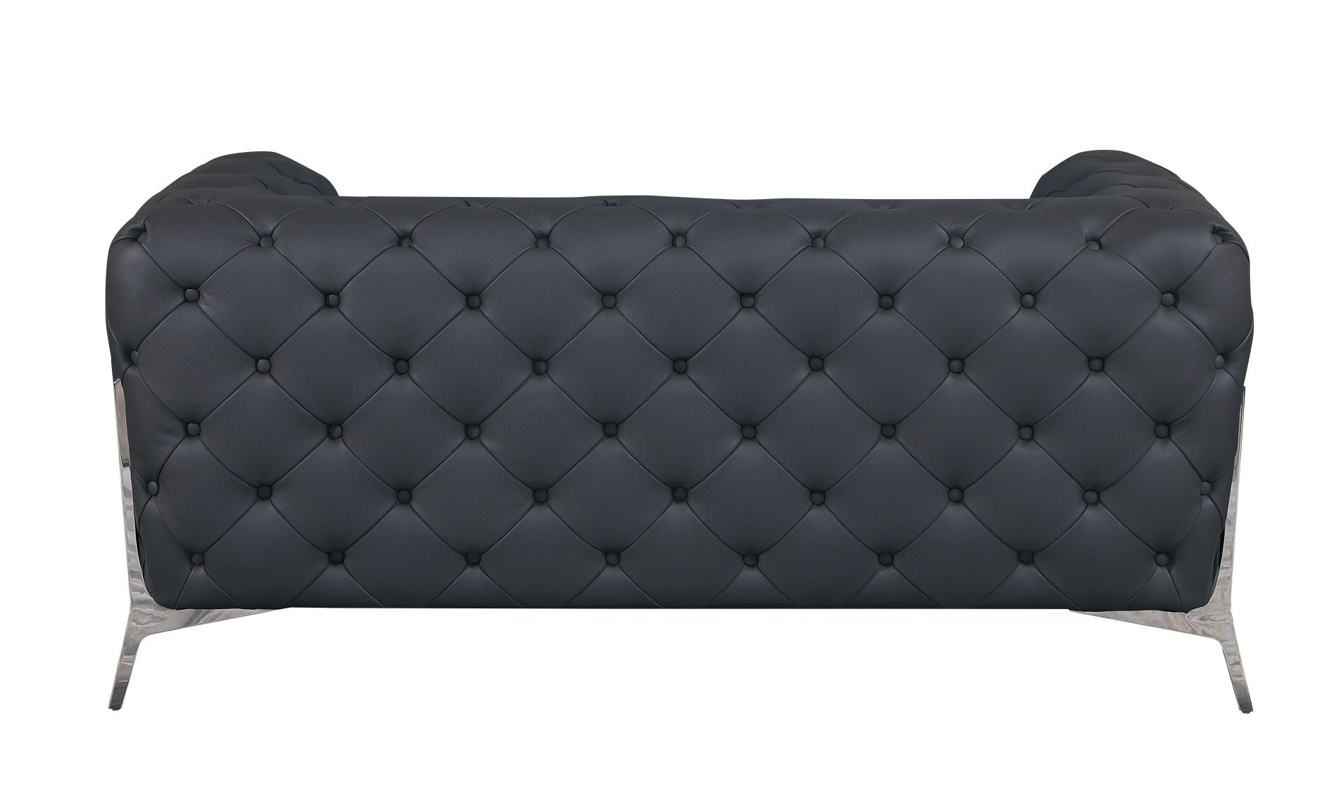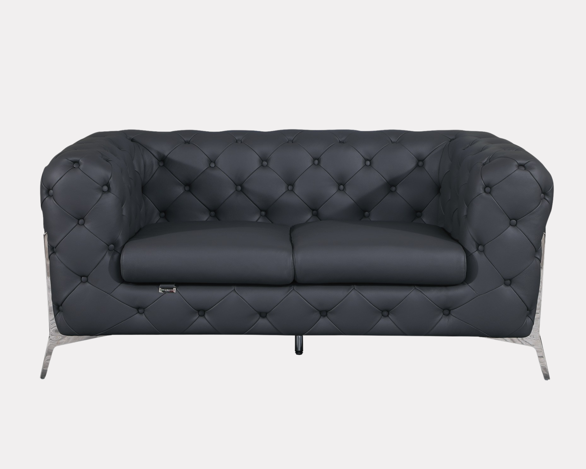 Compelling in its simple yet, cutting edge style, this 100% Top-Grain Italian leather loveseat is a bold take on contemporary design. Fall back into the luxurious comfort with this collection. The gorgeous, stainless-steel chrome legs and trim ads a beautiful contrast to the Italian leather upholstery. Distinguished by the minimal silhouette, plus cushioning, and hovering expression, this sofa set will transport you to an atmosphere of refined elegance. Starting from the designs to the finished product, each step of the production is checked rigorously for quality. The selection of Top-Grain Italian leather for the upholstering and solid wood for the frame is done with the utmost respect for the finest raw materials. Italy is world renowned for high quality leather. You can smell, feel and see its high quality in every sofa set.