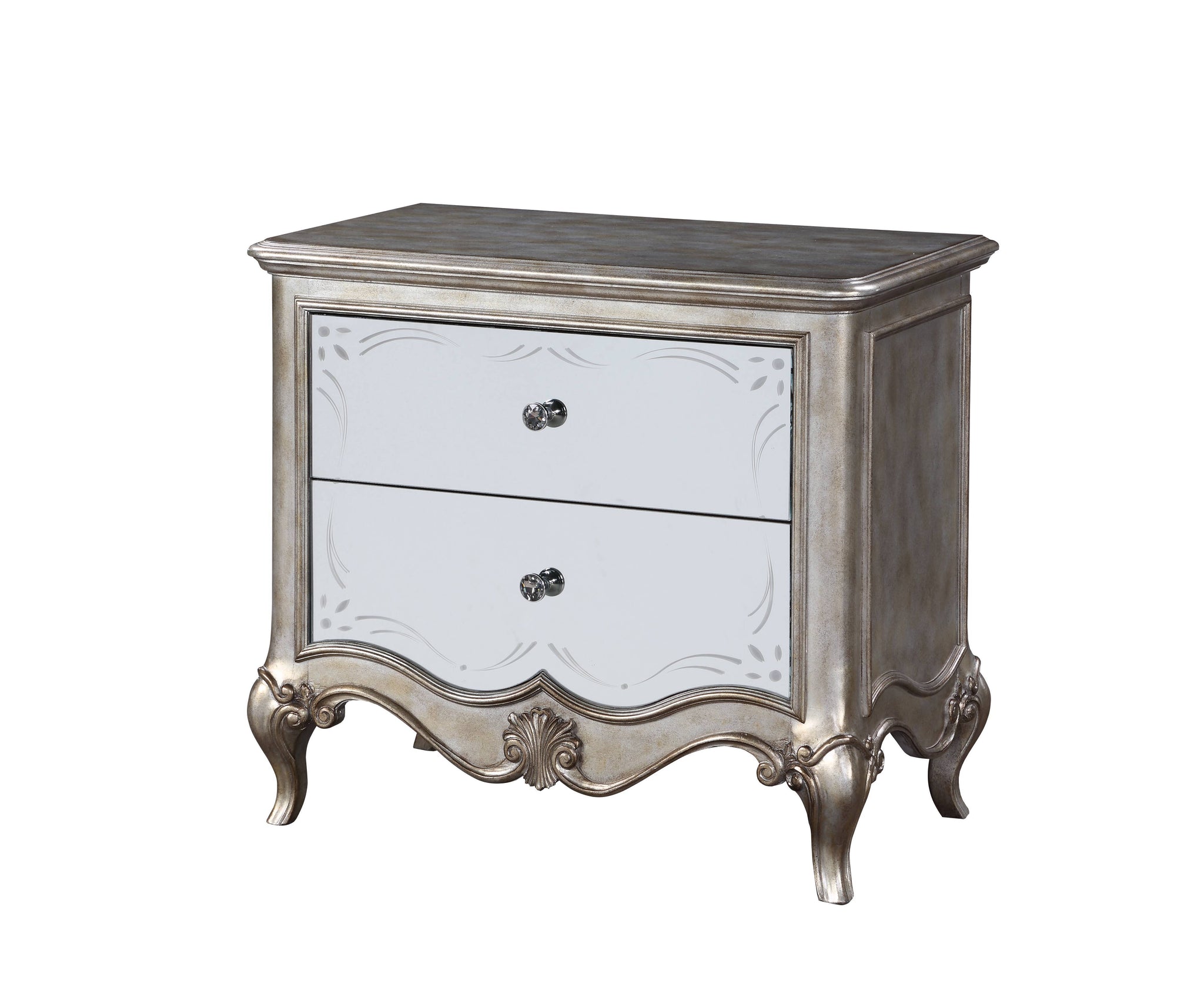 - Elegant Design: This antique champagne nightstand features glamorous mirrored fronts and a sophisticated design, exuding luxury and elegance. Its vintage-inspired charm is highlighted by sparkling crystal-like pull-knob hardware.