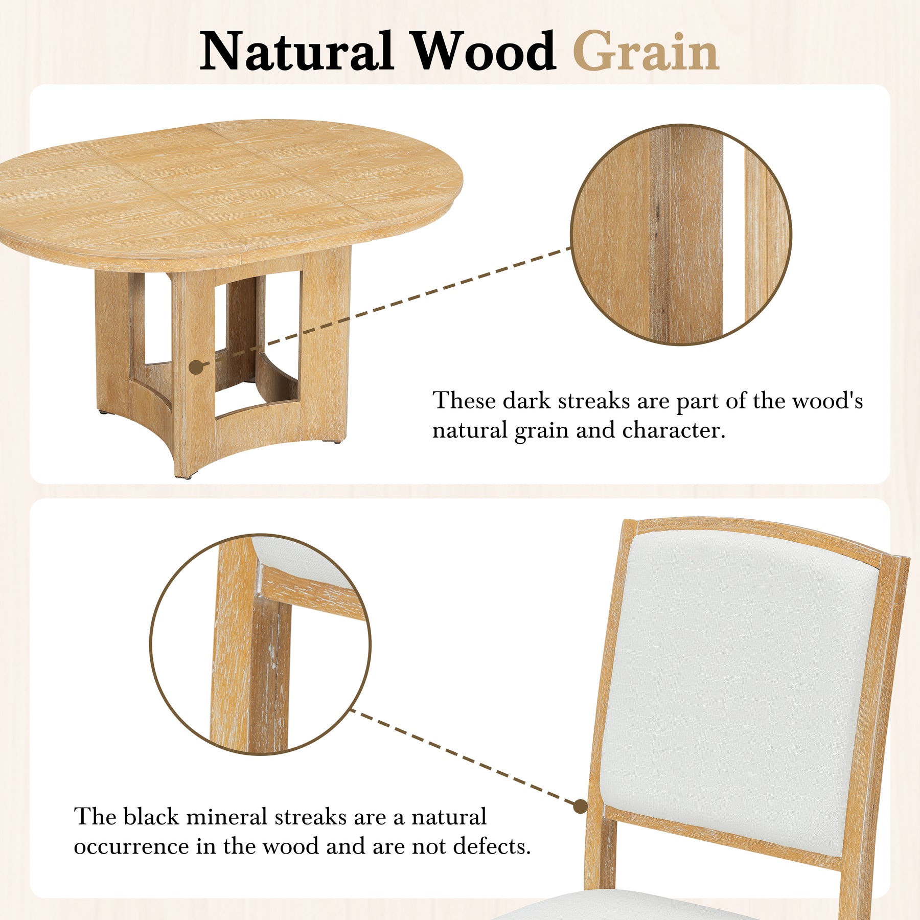 | Highlights | Solid Wood Frame // Extendable Dining Table // 16inch Removable Leaf // Pedestal Table Legs // Sturdy Curved Legs // Anti-Scratching Foot Pads // Set of 4 Dining Chairs // Upholstered Seat // 250lbs Weight Capacity for Each Table // 300lbs Weight Capacity for Each Chair // 2 Colors Available // Distressed White or Black Wire-brushed Design for Natural Set |