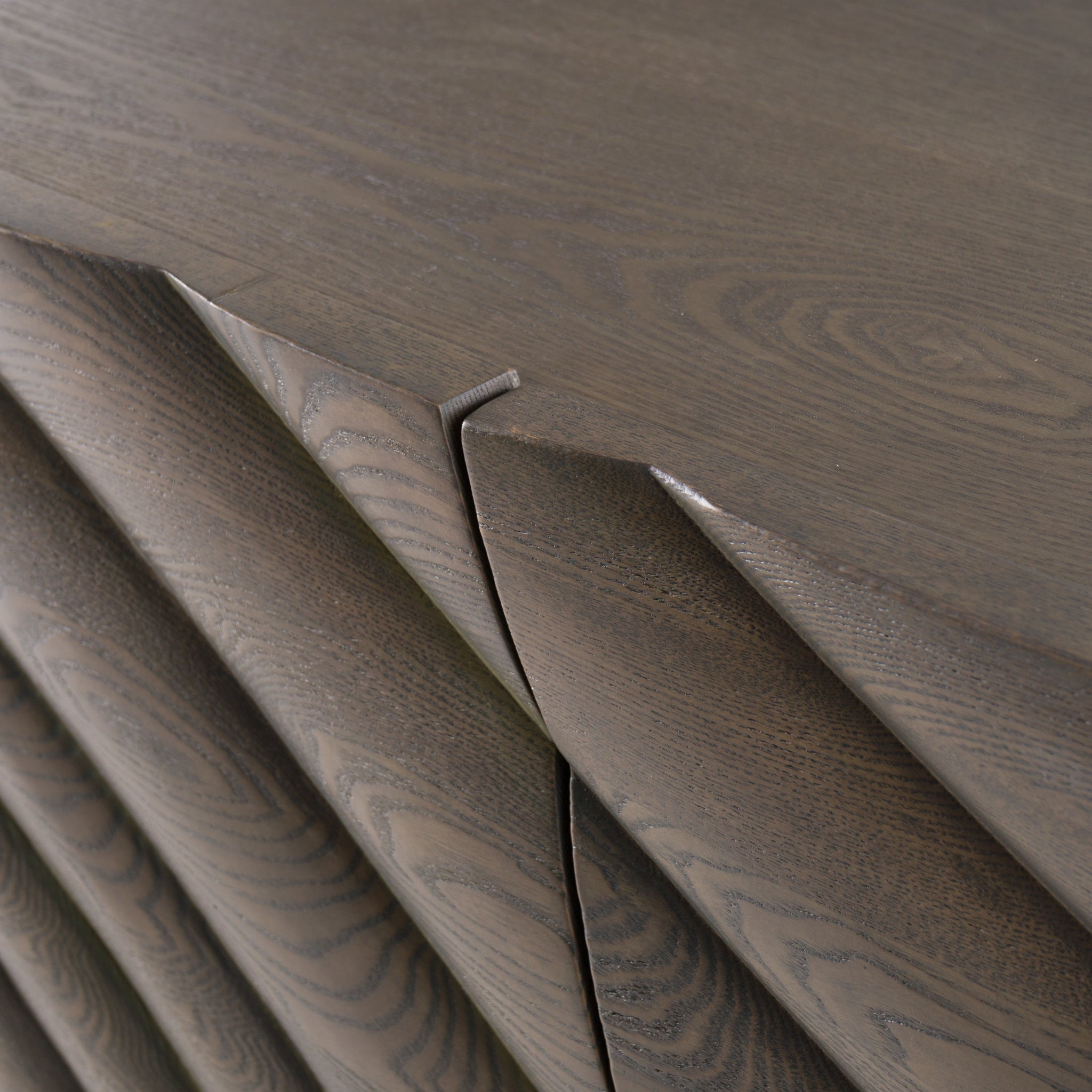 The Modrest Finley Mid-Century Grey Ash Buffet is a statement of timeless sophistication, merging clean lines with rich textures. Wrapped in a sleek grey ash veneer, this exquisite piece exudes a subtle elegance, while its brushed stainless steel legs elevate its mid-century modern appeal. The four spacious doors, crafted from grey ash wood, conceal ample storage, perfect for organizing a chic dining space or living room. A testament to refined craftsmanship, this buffet brings an understated luxury that seamlessly blends with the aesthetics of a contemporary, design-forward home.