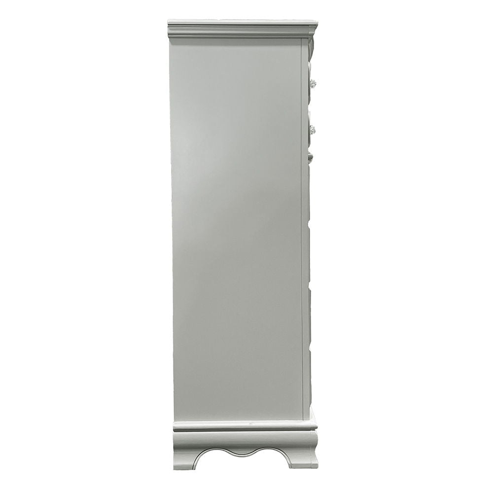 Fulfill your little girl's dream of being a princess by creating a royal retreat with the Flora chest. This frilly chest features a scalloped base with a beautiful floral motif detail for an added girly touch. Its six drawers ensure there is enough storage for all their ballgowns and accessories. The gray finish is perfect for a modern princess. This chest is sure to make your little one beam with happiness.