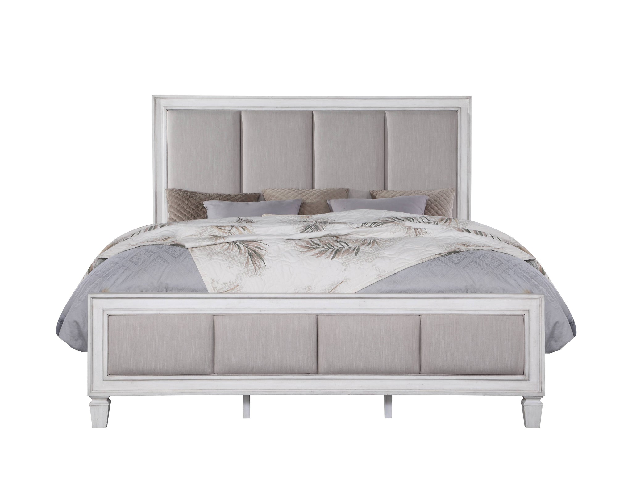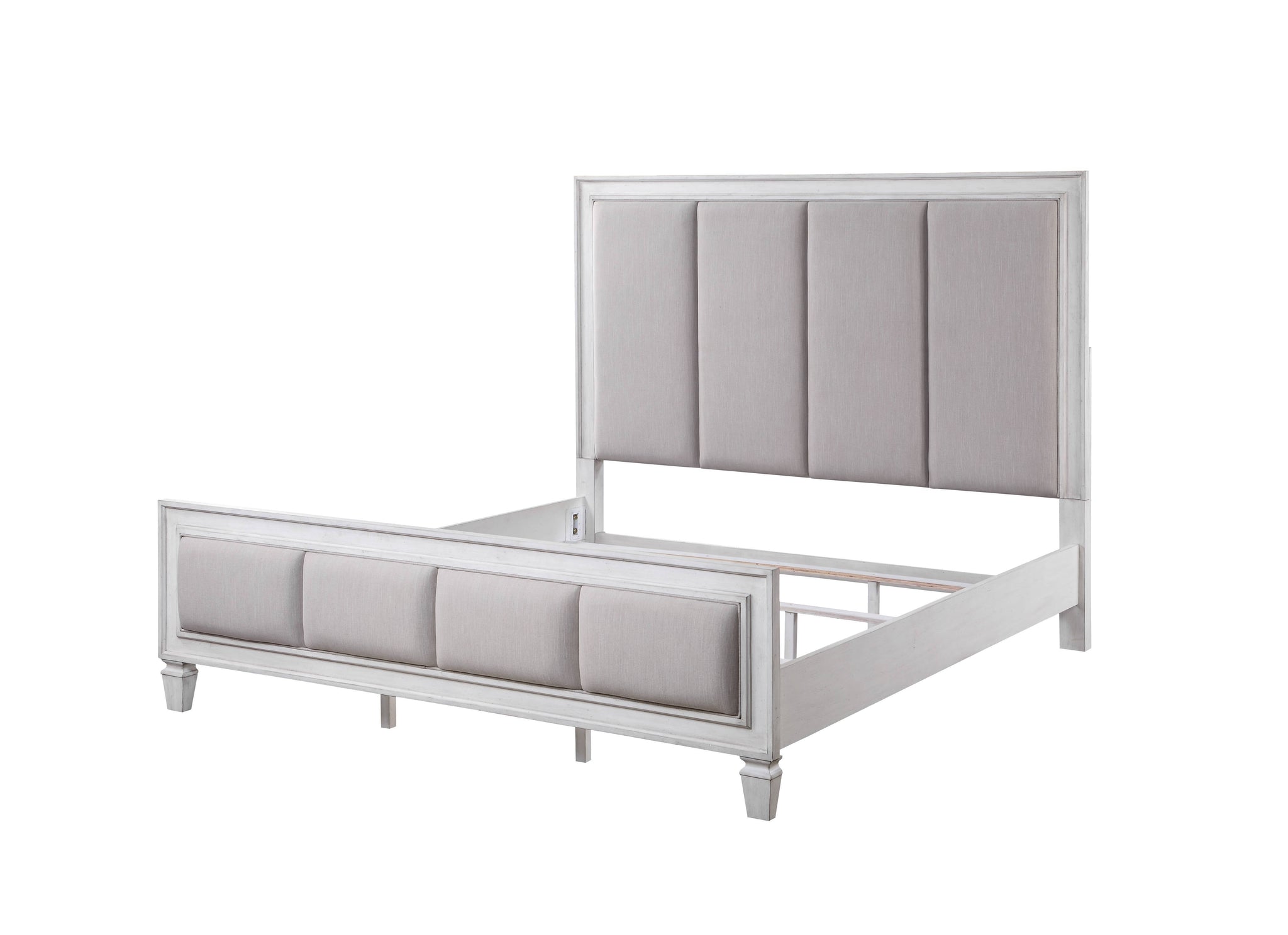 • Transitional Elegance: The Eastern King Bed in Light Gray Linen with Rustic Gray and Weathered White Finish brings understated elegance to any bedroom, blending seamlessly with various decor styles.