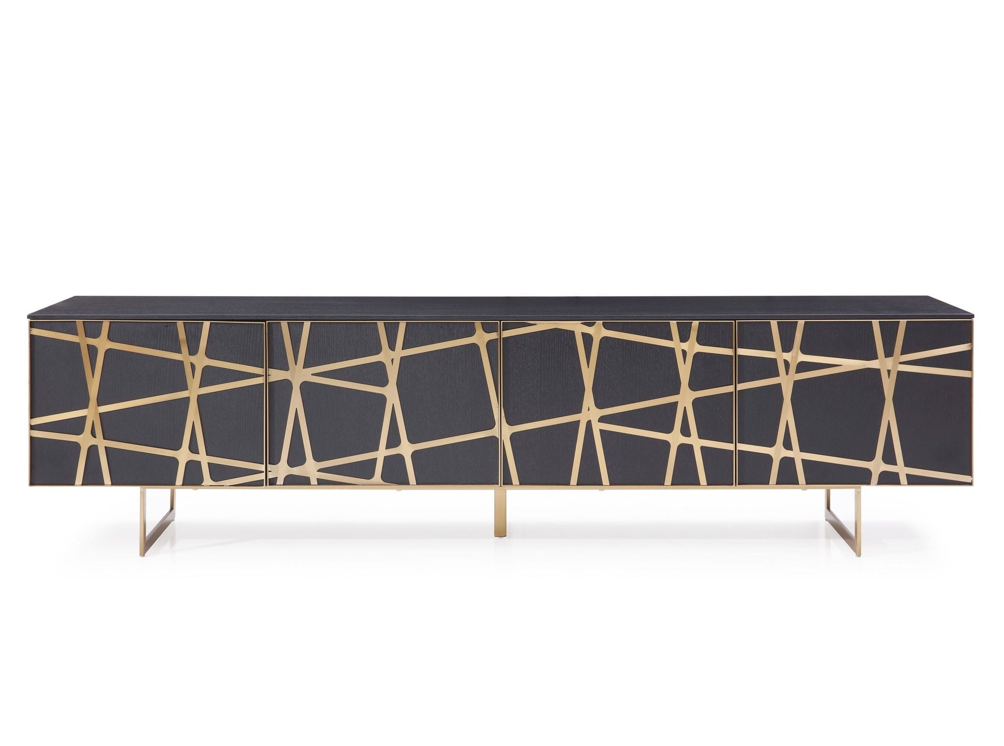The Kilson TV Stand is a black ash veneer TV stand with champagne gold accents. The geometric pattern makes it perfect for a mod or mid-century style room. The finishes add class to a modern style and the construction is sturdy. At 87 wide, this TV stand can hold a 32-74 inch tv with plenty of space leftover. The stand has four doors and two shelves. This modern contemporary piece is the perfect showstopper."