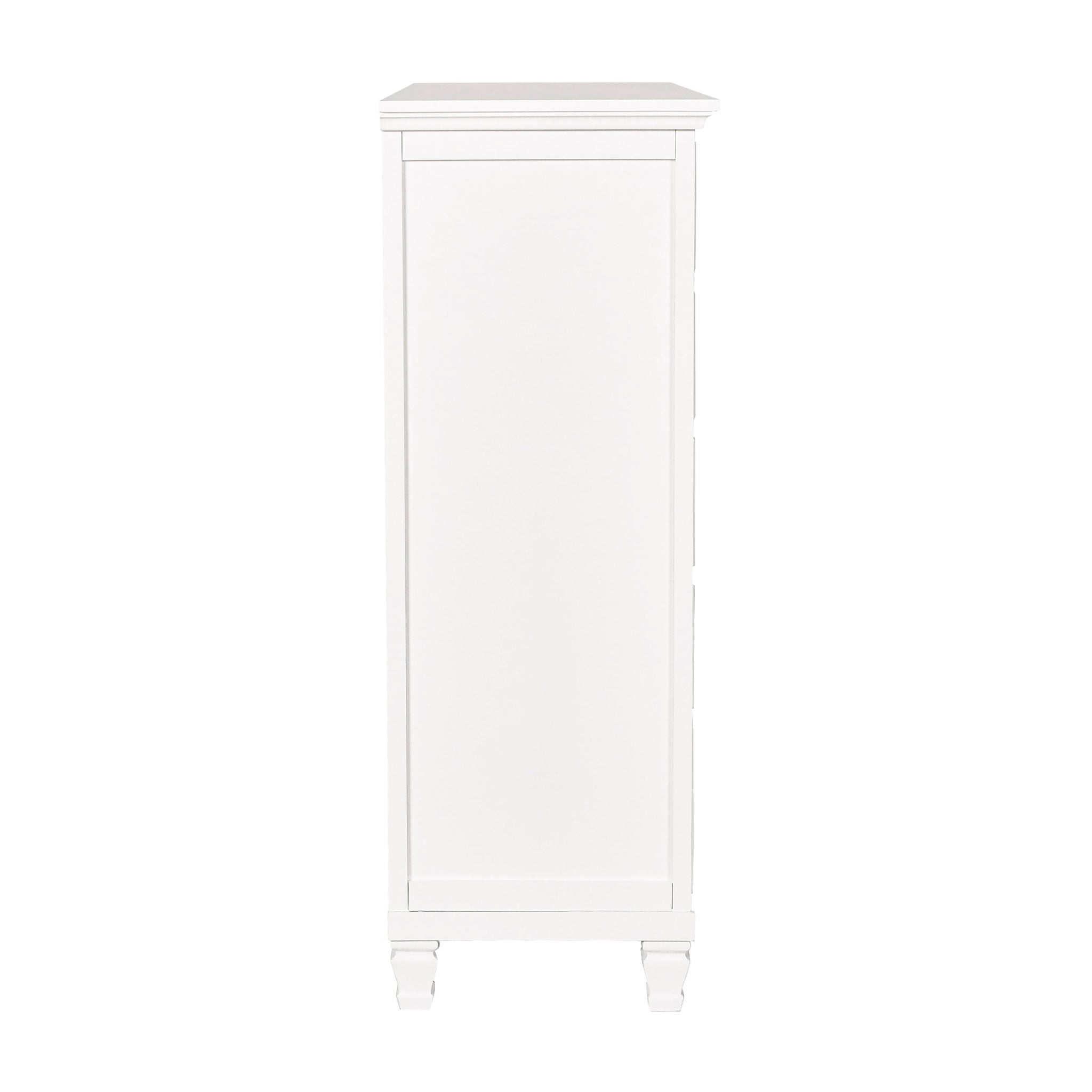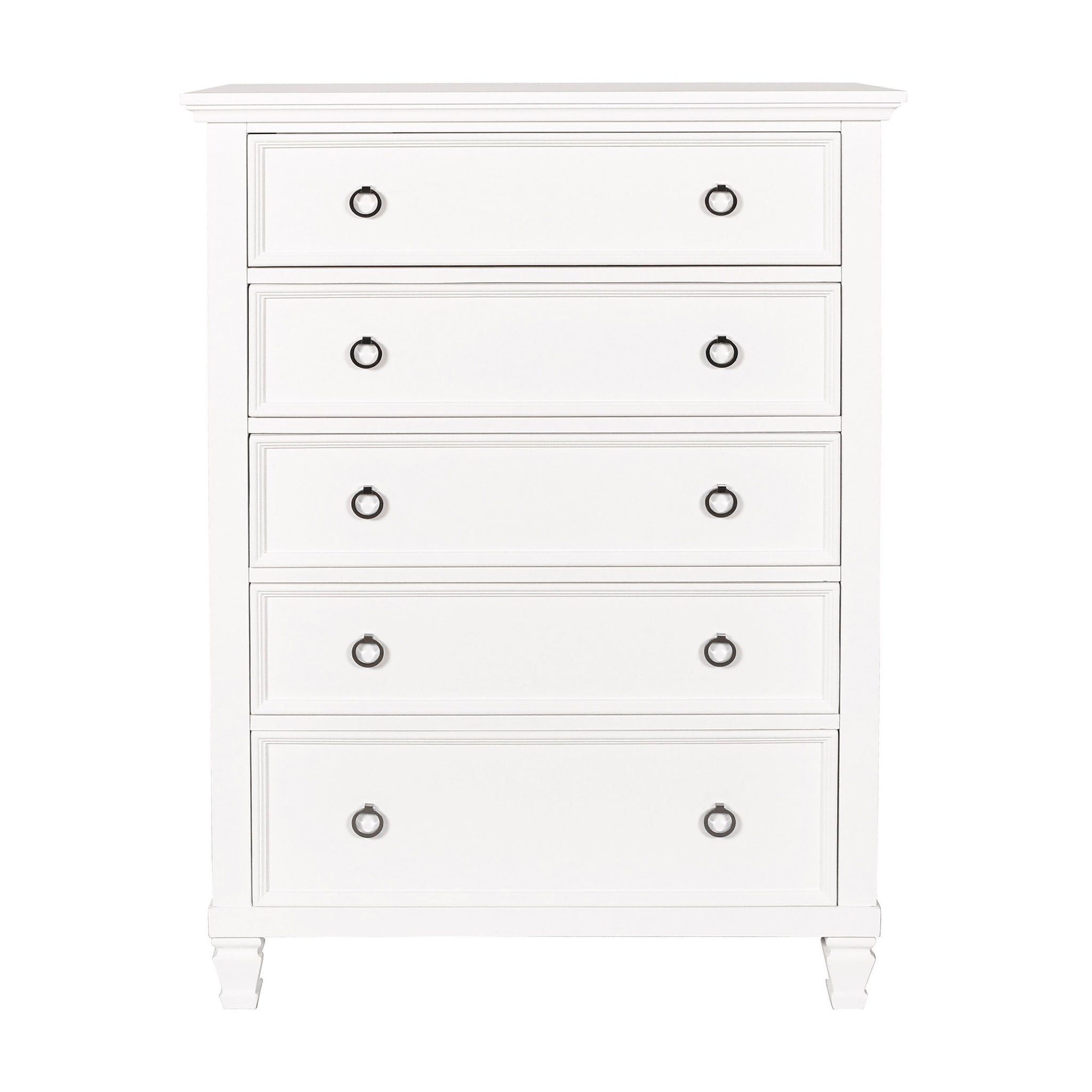 The Tamarack Five Drawer Chest is crafted of real wood solids and veneers for durability and strength. This space-saving 50" tall dresser provides ample storage in a compact area. The gleaming bright white finish is complemented by silver finished round drawer pulls. The roomy drawers roll smoothly on side mounted drawer glides and are constructed with 4-corner English dovetail joinery for long lasting use. The versatile style of this chest fits into coastal, traditional and contemporary styles and provides plenty of room to house your garments.