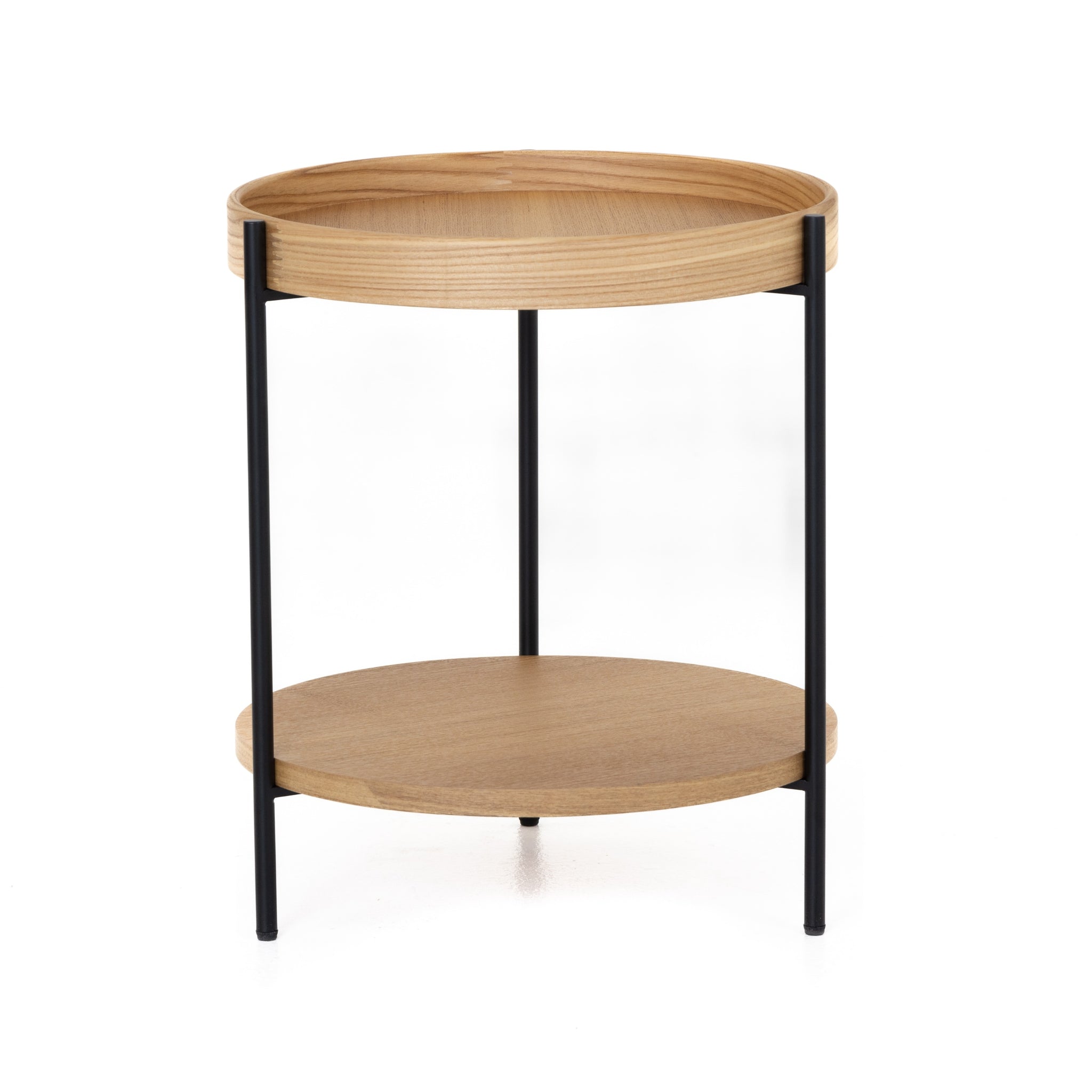 The Modrest Savoy Modern Natural Ash End Table showcases a sleek and contemporary design, featuring a circular wooden top with a subtle raised edge, perfect for displaying decor or resting drinks. Its natural ash finish adds warmth and character, while the black metal legs provide a striking contrast, enhancing its modern aesthetic. The lower round shelf offers additional space for storage or display, making it both functional and stylish. This end table effortlessly complements various interior styles, from minimalist to rustic.