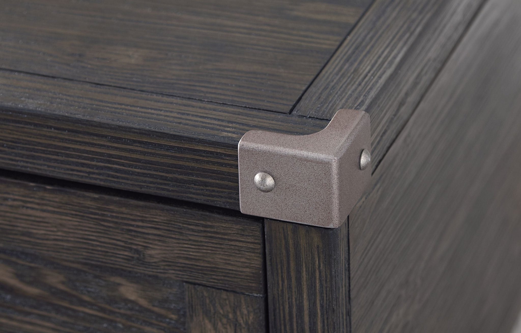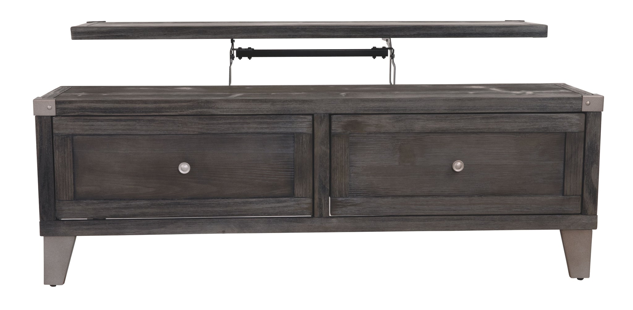 Mixed material lift top table truly elevates rustic-industrial style. Weather-washed pine wood and veneers are contrasted with canted metal legs and corner bracket accents for a uniquely chic merger of earthy beauty and contemporary flair. A handy spring-loaded mechanism brings the tabletop to you, while two drawers with removable storage trays are packed with possibilities.