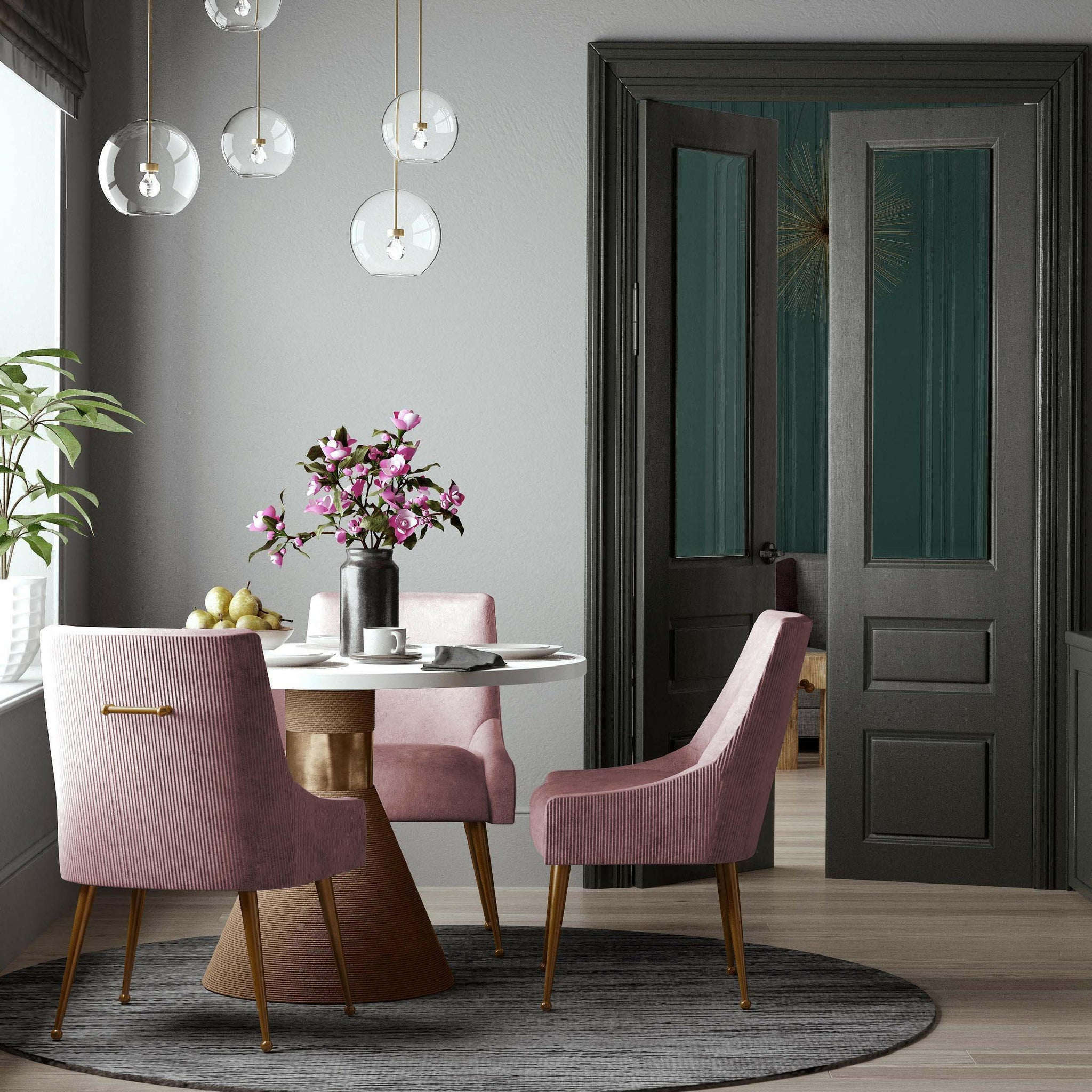 Sit pretty in this sumptuous yet durable velvet chair. The Beatrix dazzles as a dining chair or as an accent piece. Available in several colors with fab gold stainless steel legs and a matching handle on the back. Prop it into any room for a luxe, glamour effect.