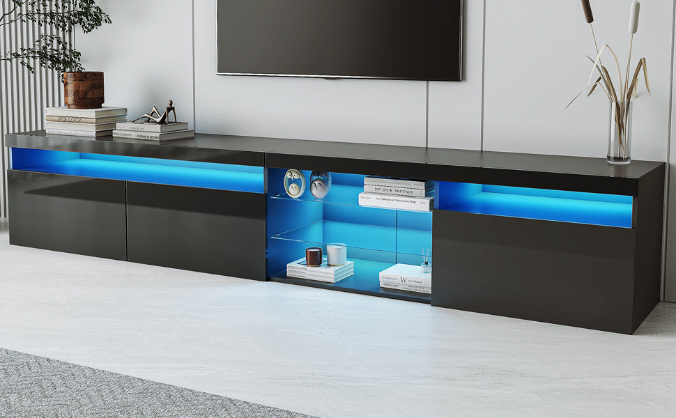 Unique Design TV Stand with LED Lights, 2 Glass Shelves, Ample Storage Space Media Console for TVs Up to 105", Black